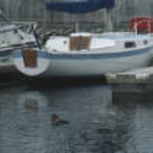 A female sea otter feeding on a moon snail while relaxing at a harbor.