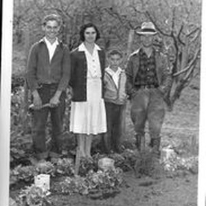 Photo--black and white: The Silva family, 1944. L-R--Sixteen year old Bill Silva, Mrs. Candida Silva, Jess Silva and Mr. Harry Silva. The Silva's stand in their vegatable garden and their Gravenstein apple orchard is seen in the backgroud. The Silva Apple Ranch and dryer were located on Cherry Ridge Road in Sebastopo.