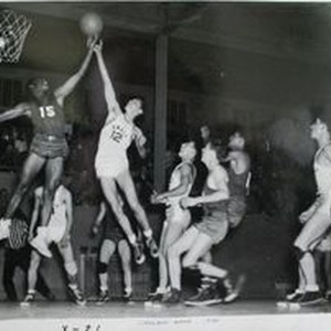 Photo--black and white: Analy High School Tigers basketball 1949. Analy vs Vallejo at Analy. Daveiro, Dave (12). Analy 33--Vallejo 30.