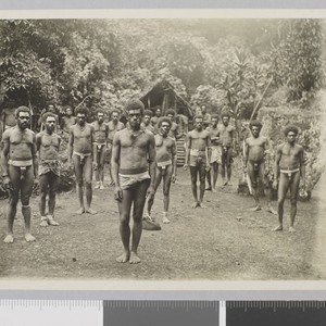 A group of about two dozen indigenous Ni-Vanuatu men stand facing toward camera, in clearing in front of a wooden structure. Title transcribed from envelope. Date devised by cataloger. . Verso of photo reads: "Port Sandwich Mallicola New Hebrides."