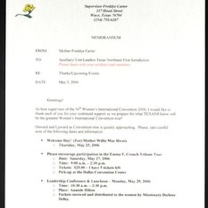 Freddye Carter (Church of God in Christ), Waco, Texas, memo, 2006 May 3, to "auxiliary/unit leaders... [&] auxiliary/unit members" (Church of God in Christ). Regarding the 56th Women's International Convention. [Description English/roman)]