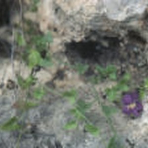 A vine with green leaves and a purple flower with yellow center grows on rocks in Slaughter Canyon, new New Cave.