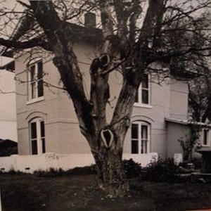 Photo--black and white: Two-story Renaissance Revival brick house at 6851 Fannen Avenue in Sebastopol built in 1905. The house has a redwood frame on which the brick face is based. This is the only two story brick house in Sebastopol.