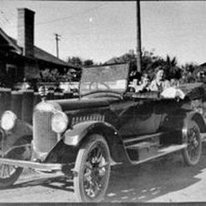 Photo--black and white, from Borba 8" x 10" celluloid negative: Two ladies and two young children seated in the back of a vintage car. Circa 1920s