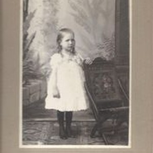 Photo--sepia, studio matted: Gertie Sharp at three years old, about 1908. Gertie is the sister of Clifford, Lester and Ethel Sharp and child of Mr. & Mrs. Earl Sharp. Shaw Studio, Third Street Gallery, Santa Rosa, CA