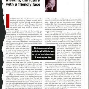 Article by Charles Handy on the necessity of maintaining human contact, both professionally and personally, in an age of increasing technology, and that technology in its most positive influence will simply add to the ways people get and pass information, without replacing them, 1995; Charles Handy Papers; Box 20, Folder 9; 1 page