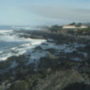 Waves roll into the tide pools and homes sit atop the cliffs, overlooking the ocean at Cambria.