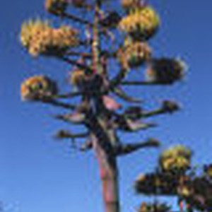 Flowering coastal agave stalk surrounded by blue sky.