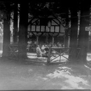 Photo--black and white, from Borba 8" x 10" celluloid negative: Rio Nido dance site near the Russian River circa 1920. Japanese lanterns are hung over picnic tables and a building in the rear. "Borba Photo" hand scratched in right bottom of photo.