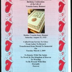 Five year remembrance & memorial birthday celebration of the life of Ventia Ioney Bonner, 2010. Booklet issued on the first anniversary of Bonner's death, 2009 March 3. [Description English/roman)]