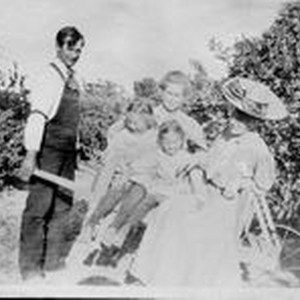 Photo--black and white: L-R: F. J. Riddell, Alice, Mrs. Eloise Riddell, daughter Blanche on her lap, and Miss Ashby, 1908.