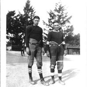 Photo--black and white: Analy Union High School football players in uniform fall of 1923. Right: Joe Mannix and left, Wilburn Talbot. Players were class of 1924.