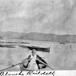 Photo--black and white: Blanche Riddell (Woods) rowing a boat at Bodega Bay, about 1920.