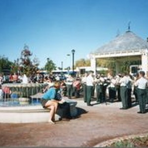 Photo--color: The opening of the Sebastopol Plaza celebration. A uniformed band is standing with the Plaza gazebo in the background.