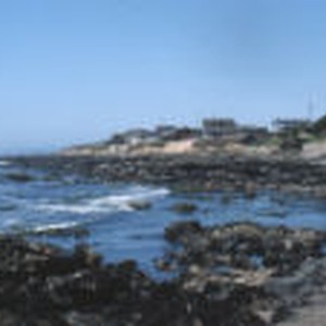 Waves roll into the tide pools while homes sit atop the cliffs on the Cambria coast.