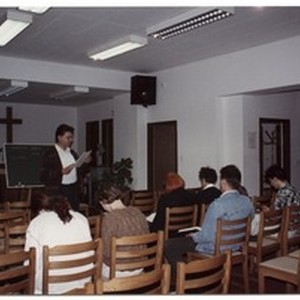 Fotografija Franca Kuzmiča kako stoji i čita ljudima. [Description (original non-English/roman language/script)] Photograph of Franc Kuzmič standing in front of people reading from a paper. [Description English/roman)]