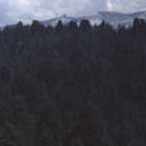 View north from Moro Rock, forest silhouette with sequoias.